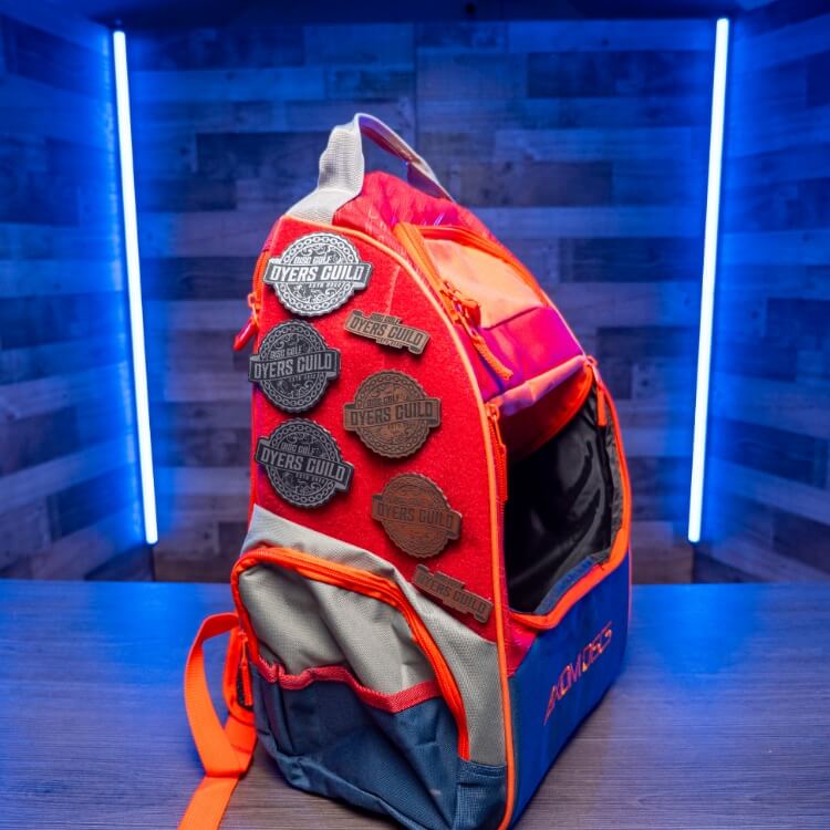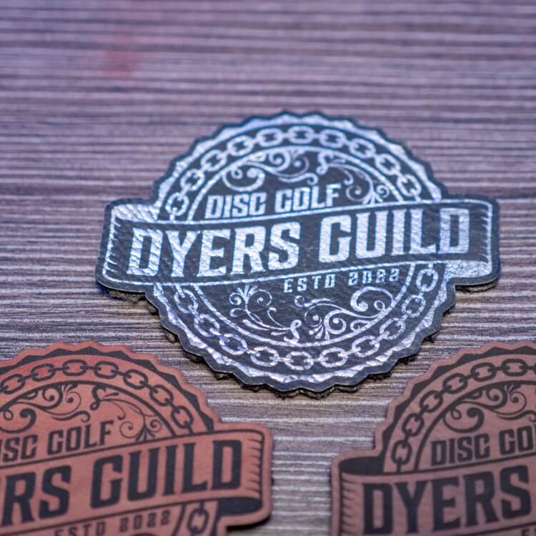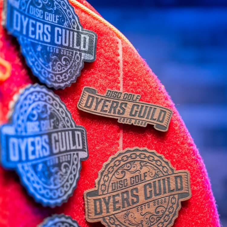 This laser-engraved leatherette patch features the official Dyers Guild logo, cleanly etched into a premium leatherette surface. With a hook Velcro backing, it sticks securely to your disc golf bag, strap, cart, or anywhere else you want to flash your dye credentials.