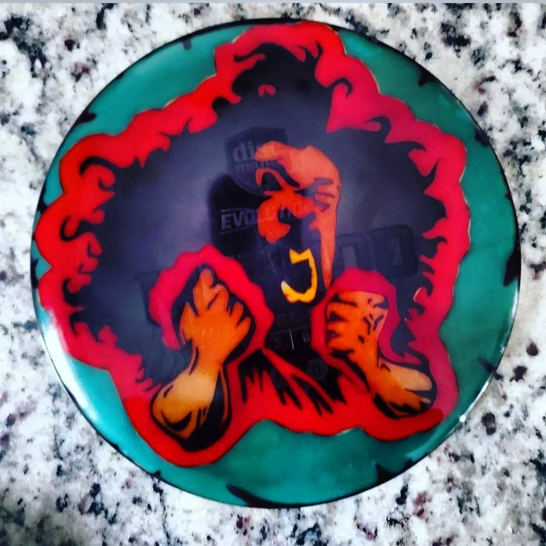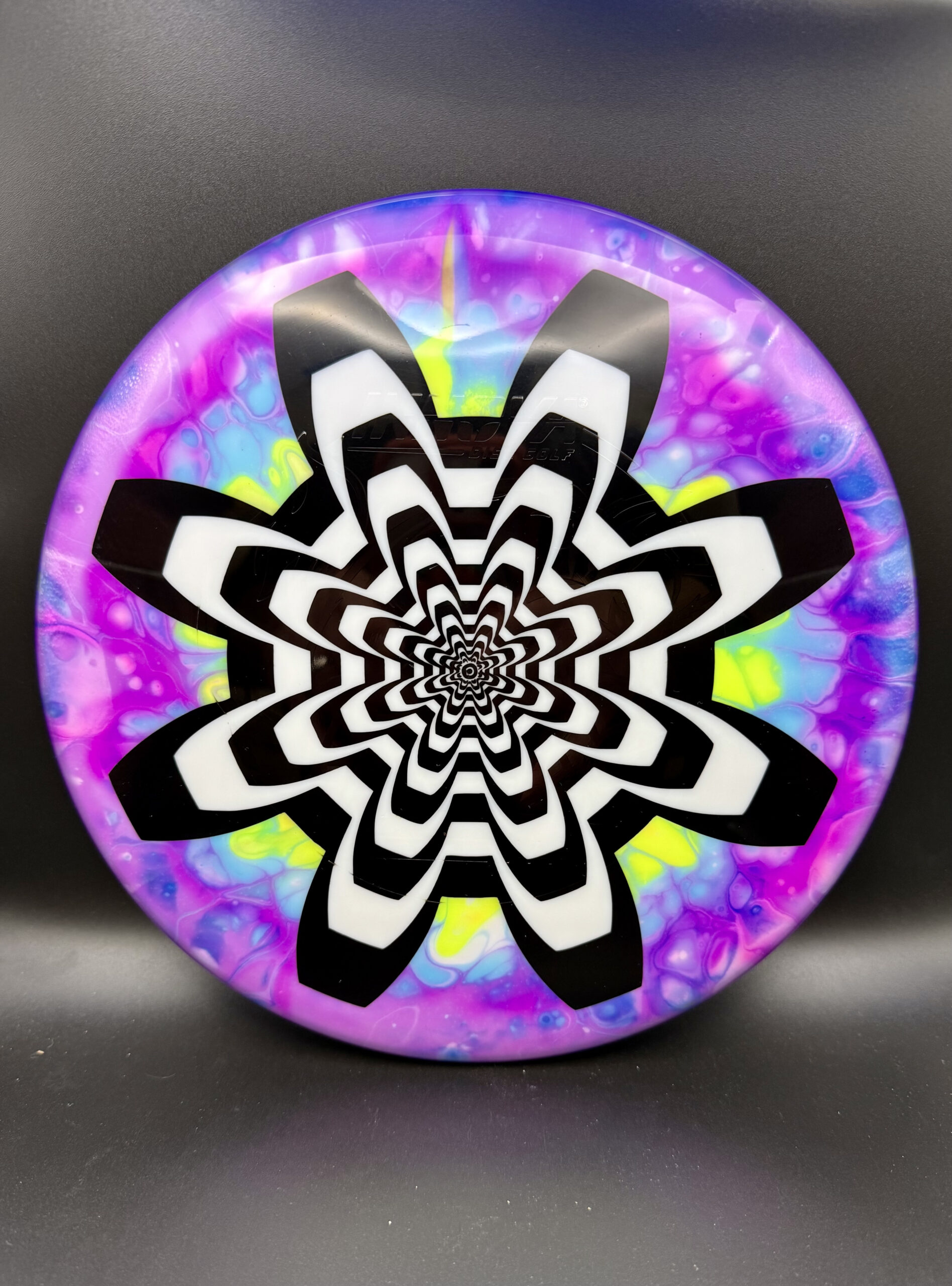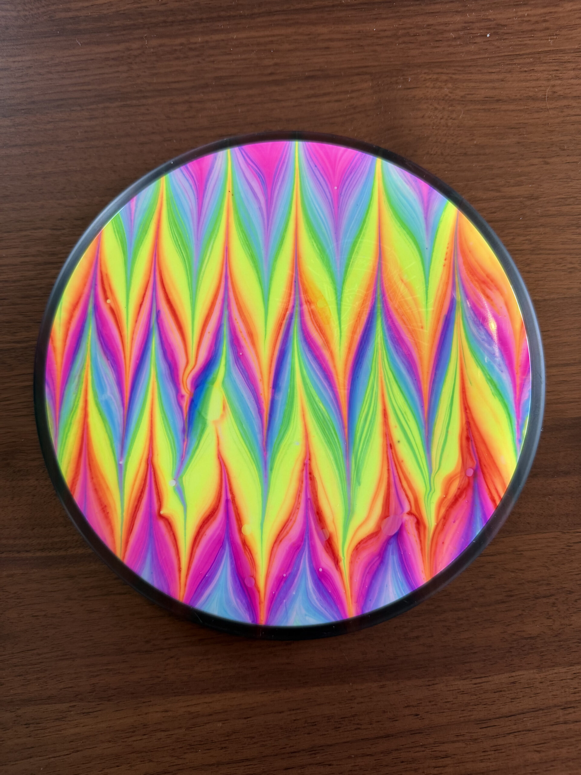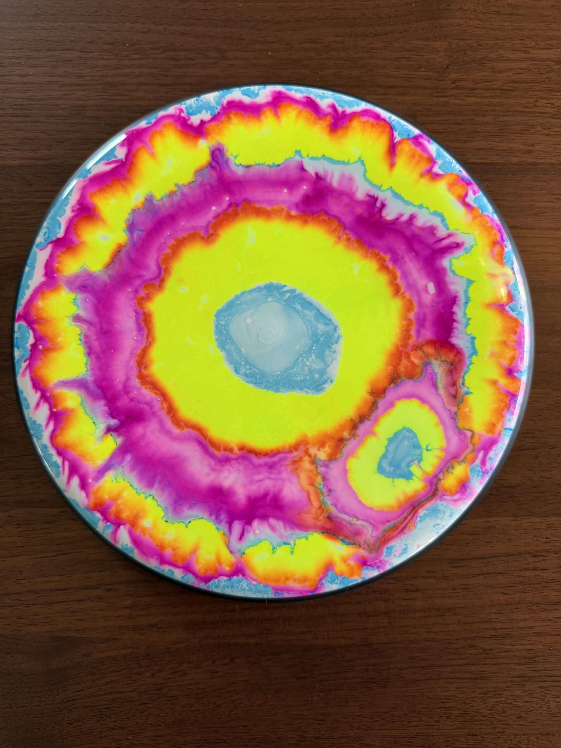 My first live was spin dyes but I’ve been gradually been leaning the arts of floetrol and vinyl stencils to round out my disc dying repertoire.