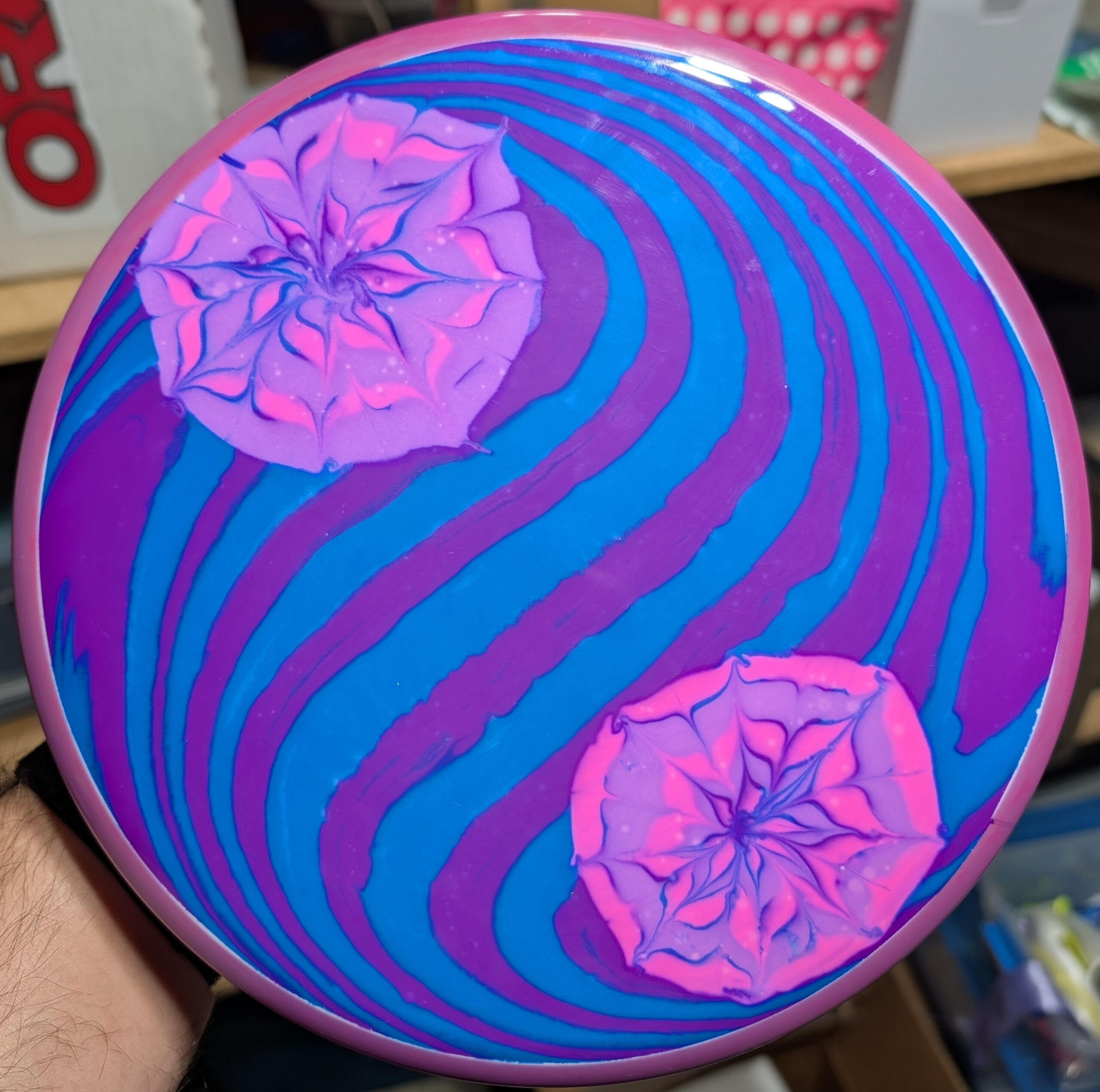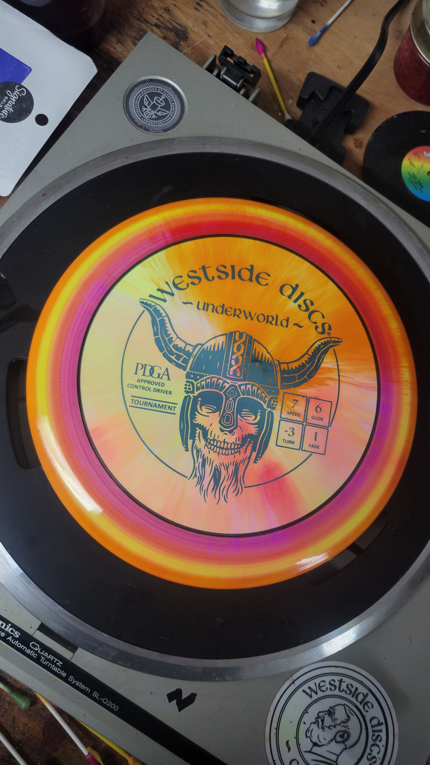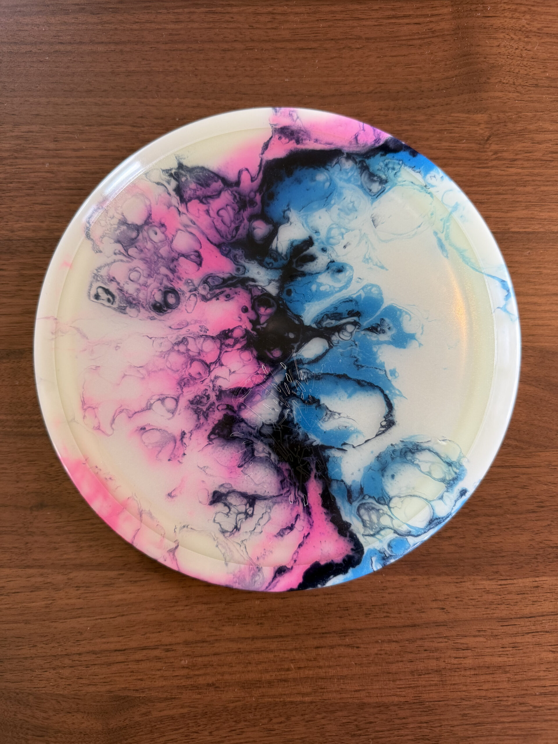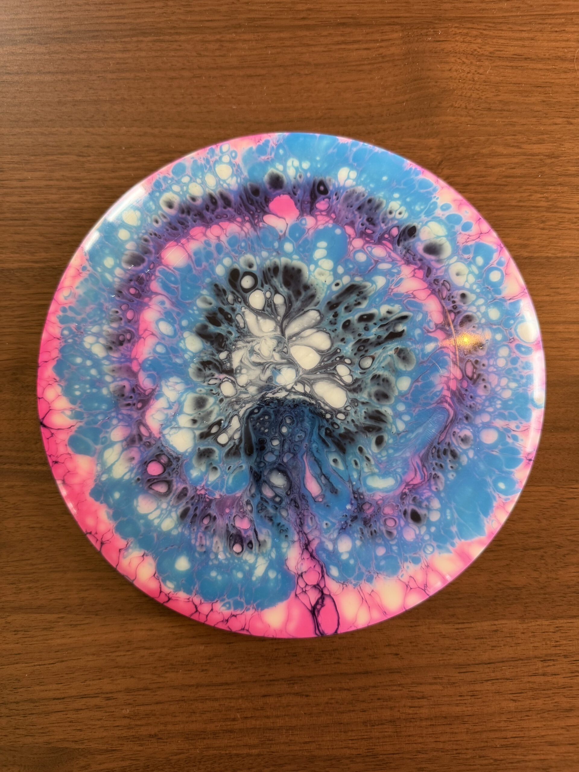 My first live was spin dyes but I’ve been gradually been leaning the arts of floetrol and vinyl stencils to round out my disc dying repertoire.