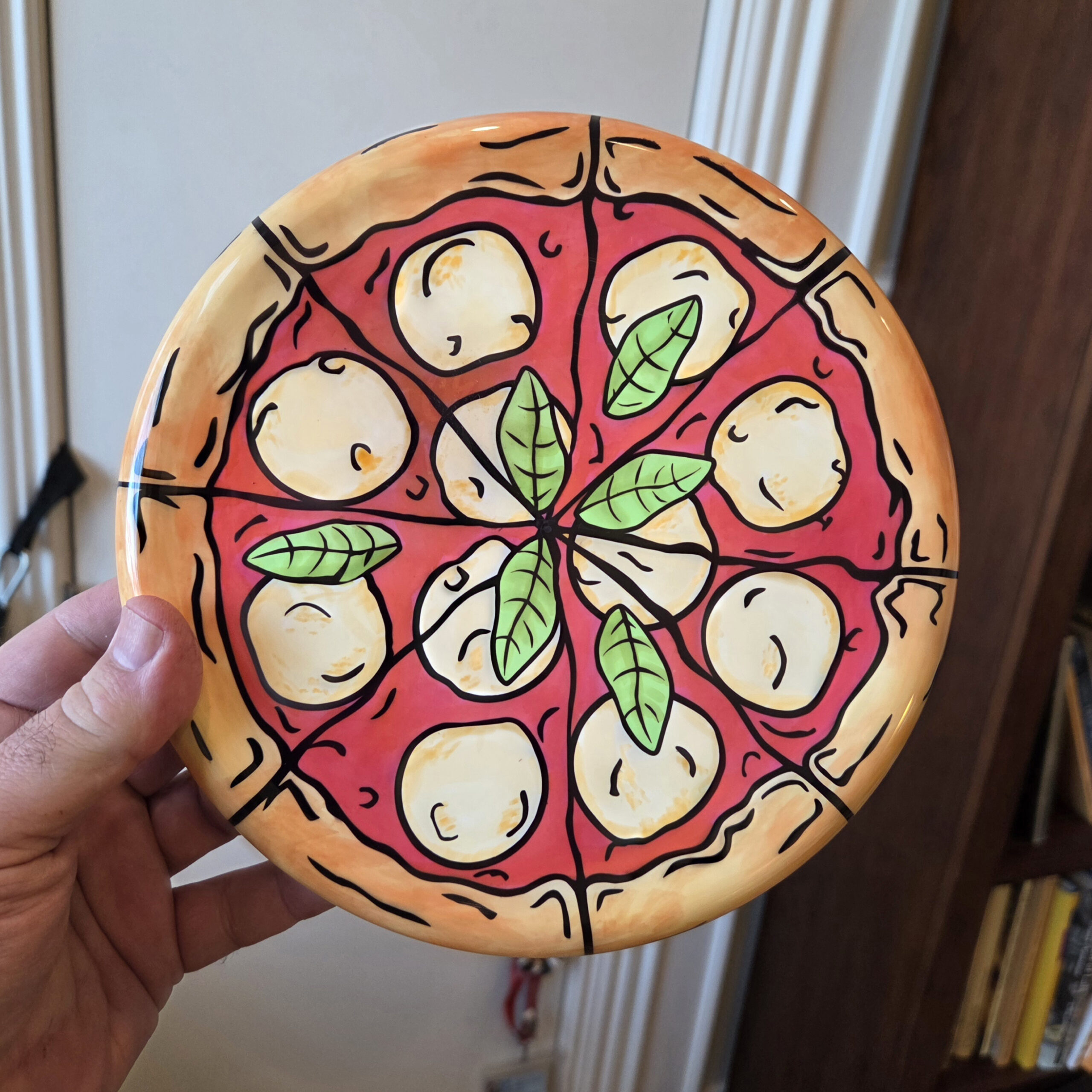 Doing a lot of lotion and DA painting lately. Usual process on pizza, stencils, hot dip to start. Lotion paint the cheese, pepperoni or basil and sauce on the pizza. DA paint in ‘grease’. Special DA mix for the crust. China pattern was lotion paint with stencil followed by DA paint.