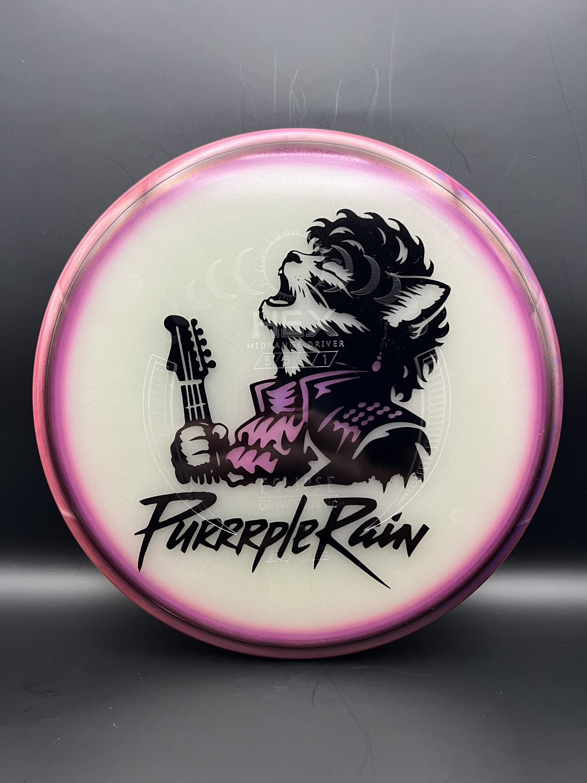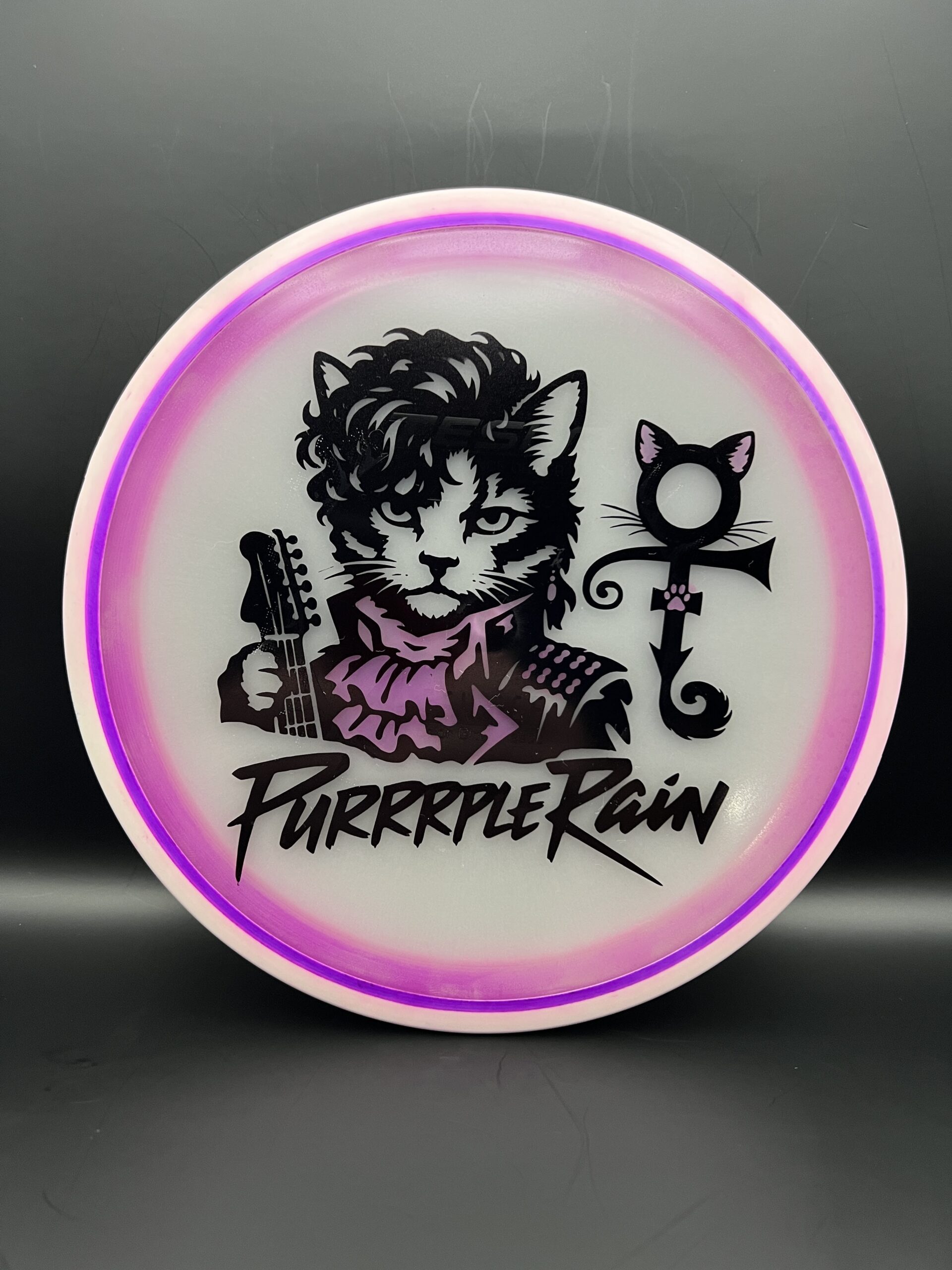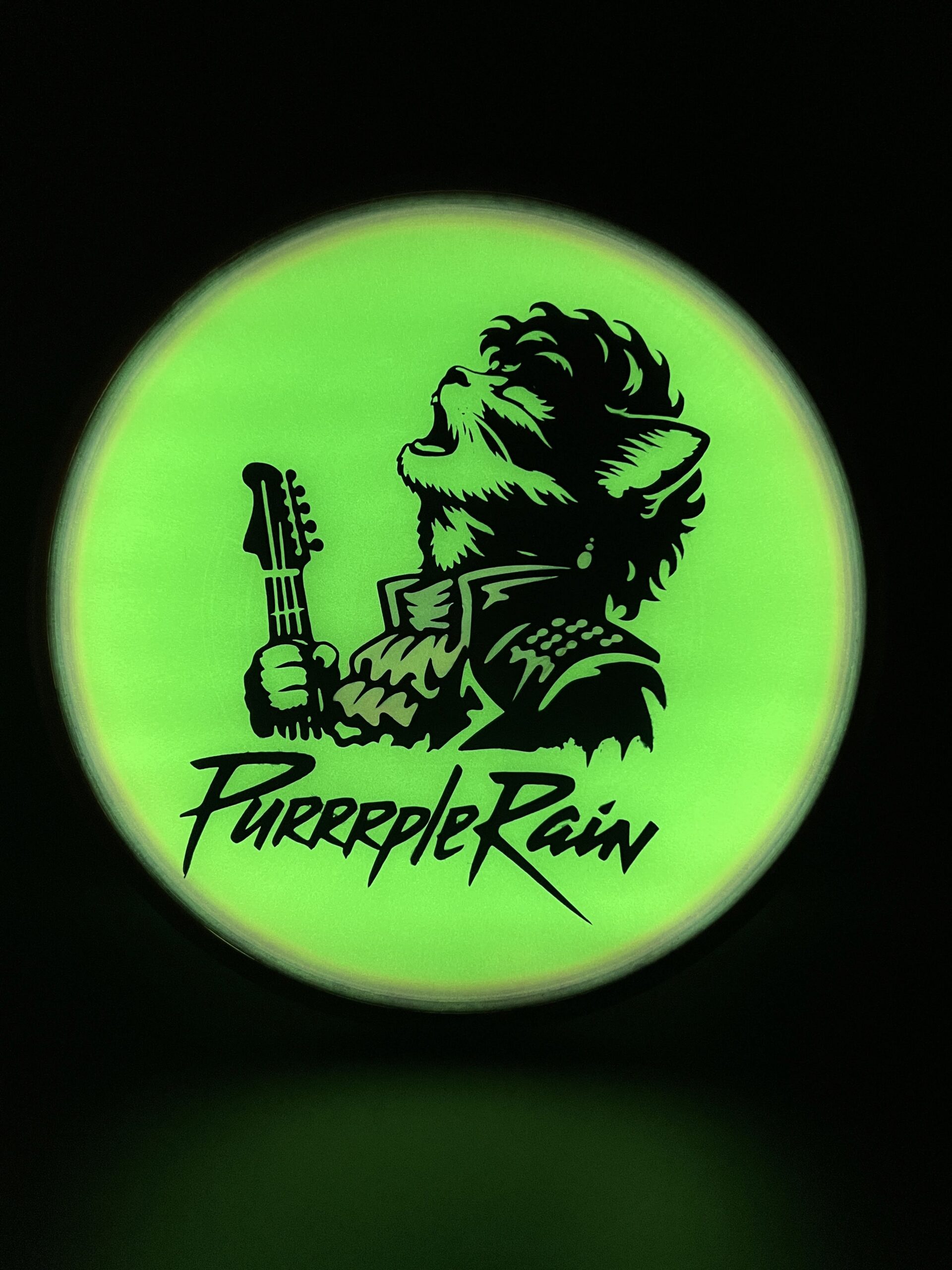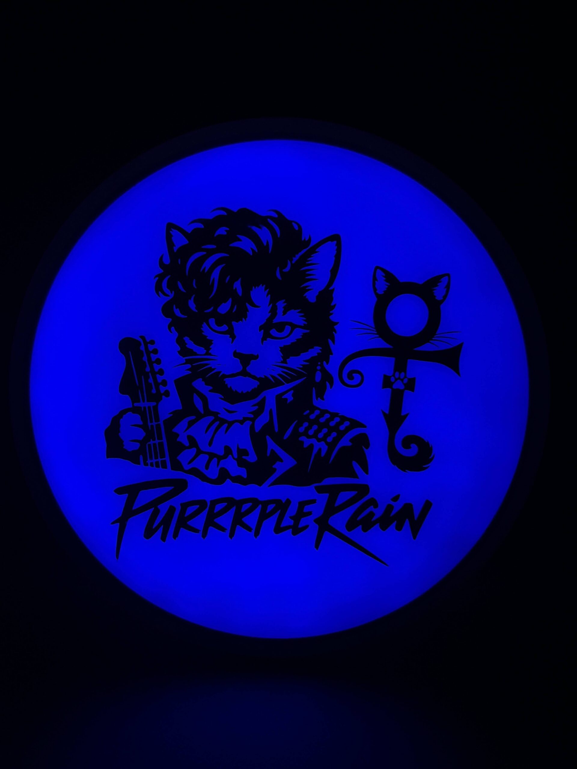 PURRRPLE Rain Stencil I’ve done a few of now. AI assistance for initial idea generation and then into Photoshop to correct issues and make it stencil friendly. Final adjustments in Silhouettes software (I have a cameo5). Process is then what you expect — Apply stencil, hot dip for black sections, then 90% Isopropyl alcohol dye mix for the colored areas. Doing them on eclipse glow discs is a nice effect too. Full process long format videos on YouTube – http://go.discdyeaddict.com/youtube + shorts on both youtube and on Instagram – http://go.discdyeaddict.com/Instagram