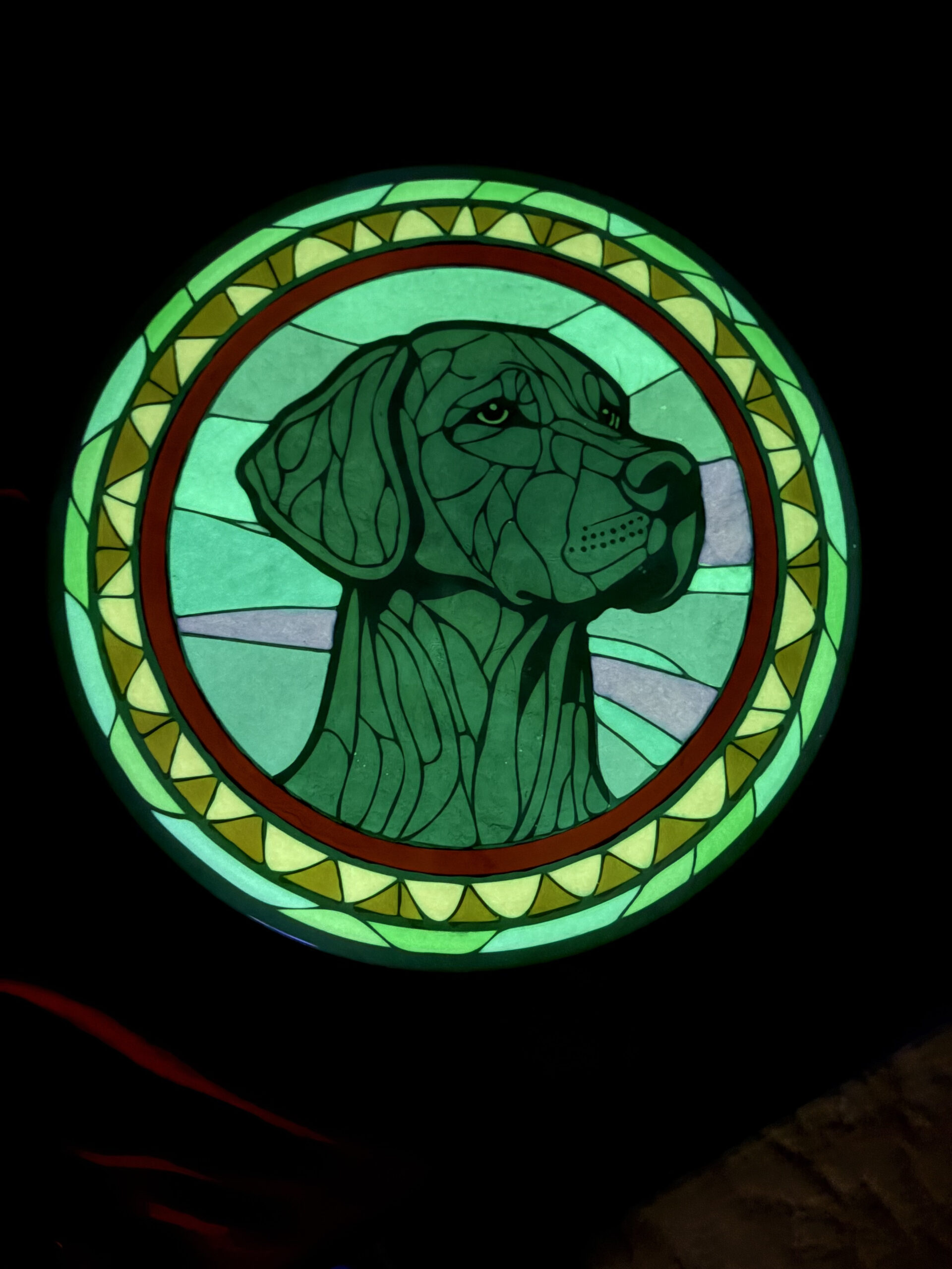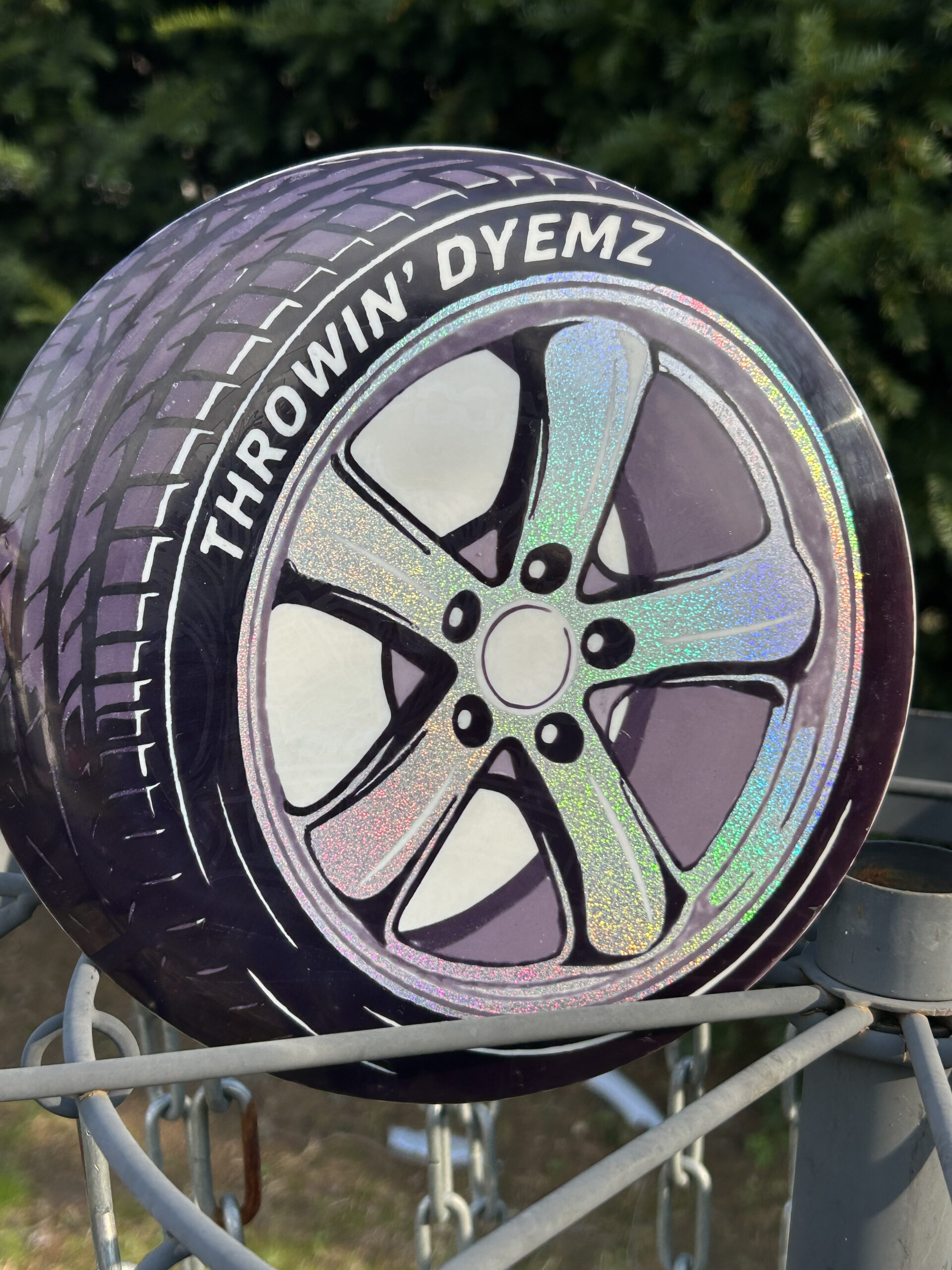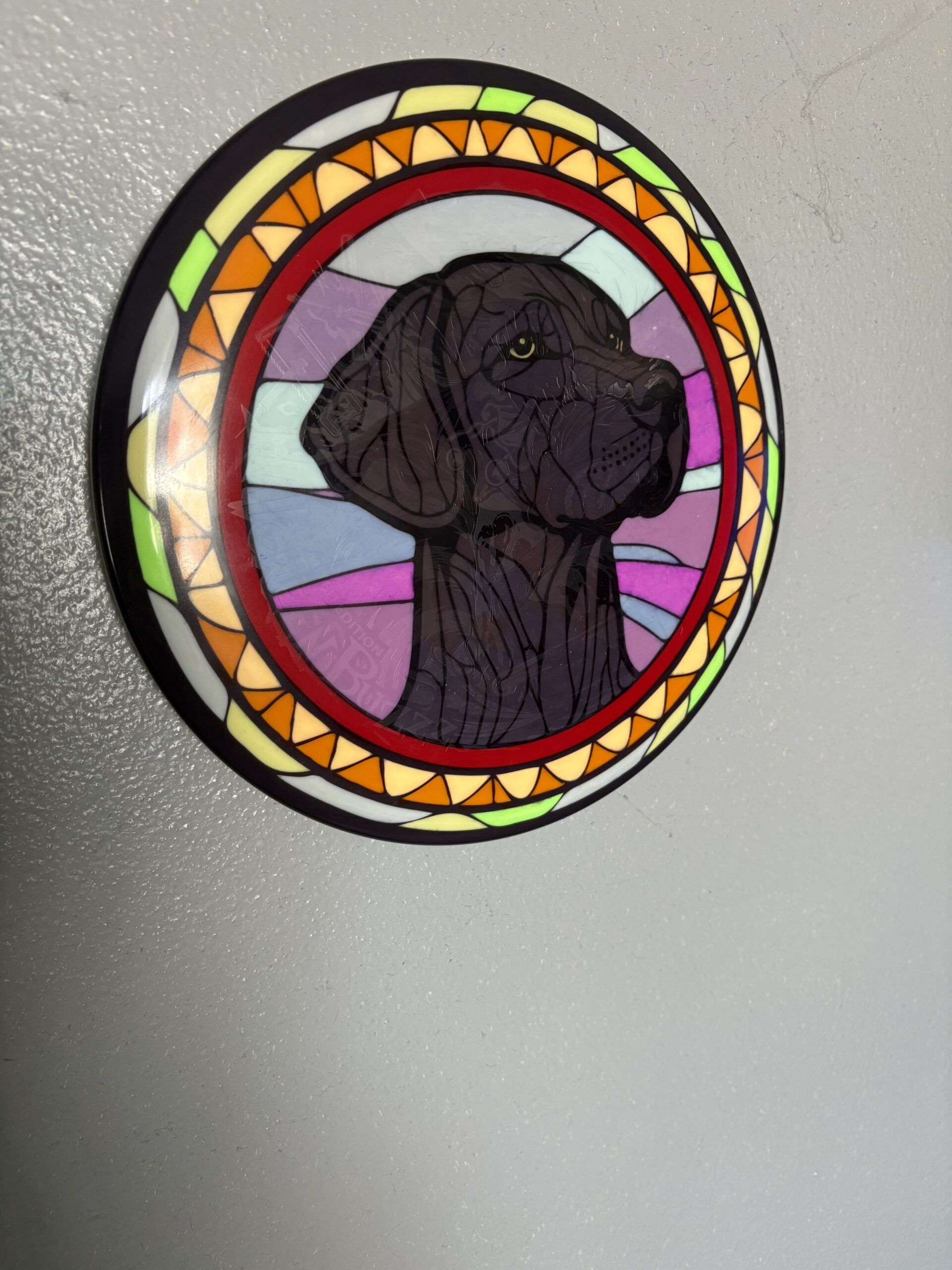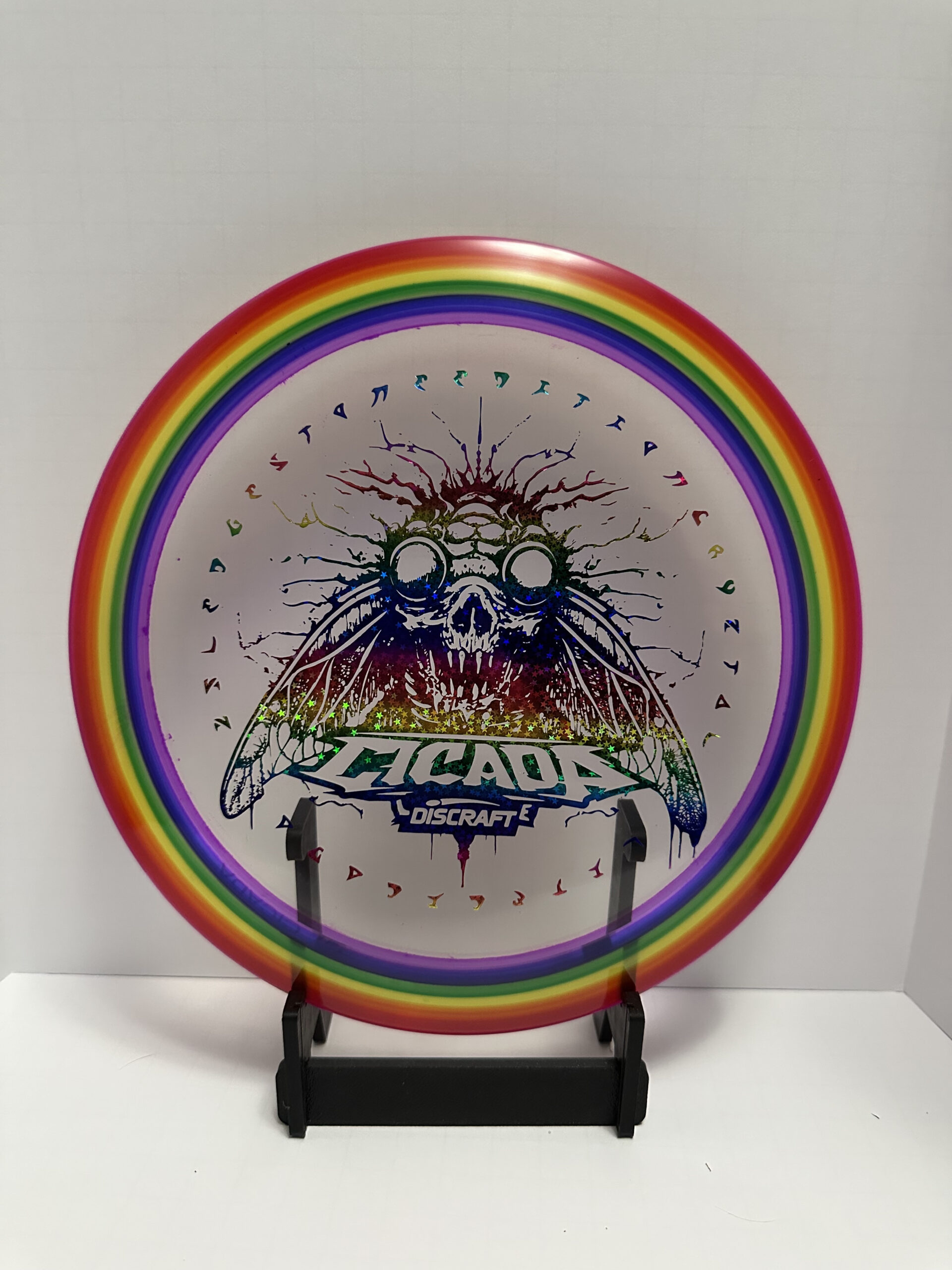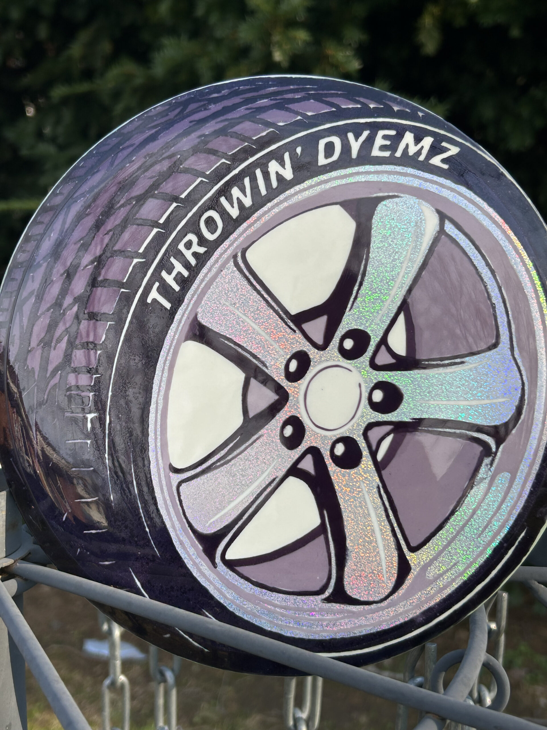 PURRRPLE Rain Stencil I’ve done a few of now. AI assistance for initial idea generation and then into Photoshop to correct issues and make it stencil friendly. Final adjustments in Silhouettes software (I have a cameo5). Process is then what you expect — Apply stencil, hot dip for black sections, then 90% Isopropyl alcohol dye mix for the colored areas. Doing them on eclipse glow discs is a nice effect too. Full process long format videos on YouTube – http://go.discdyeaddict.com/youtube + shorts on both youtube and on Instagram – http://go.discdyeaddict.com/Instagram